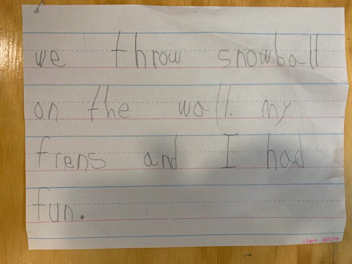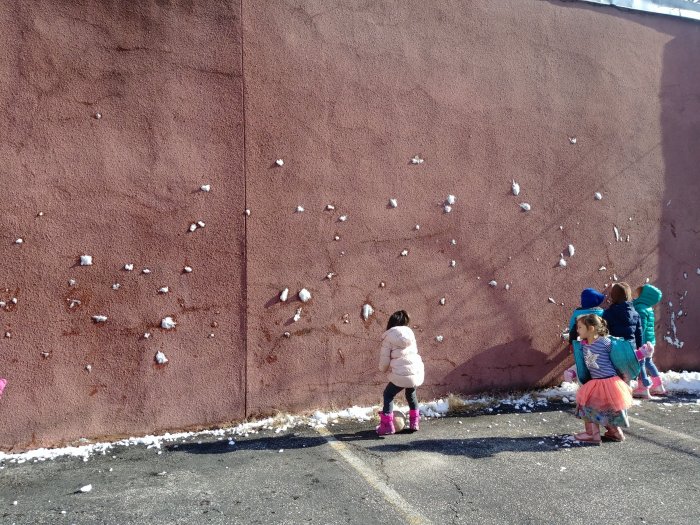 We like to throw snow, but its not nice to throw things at our friends. So, we throw snow at the wall, then we write about it. That’s how we Montessori!